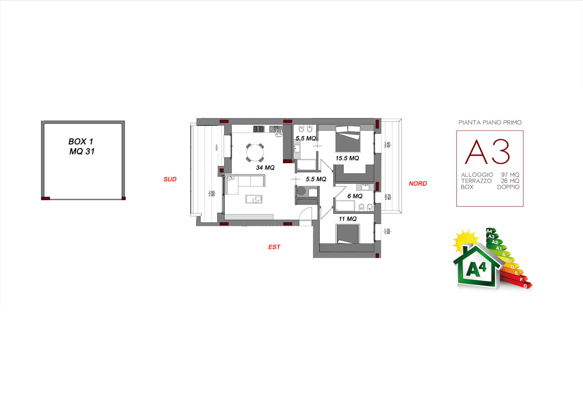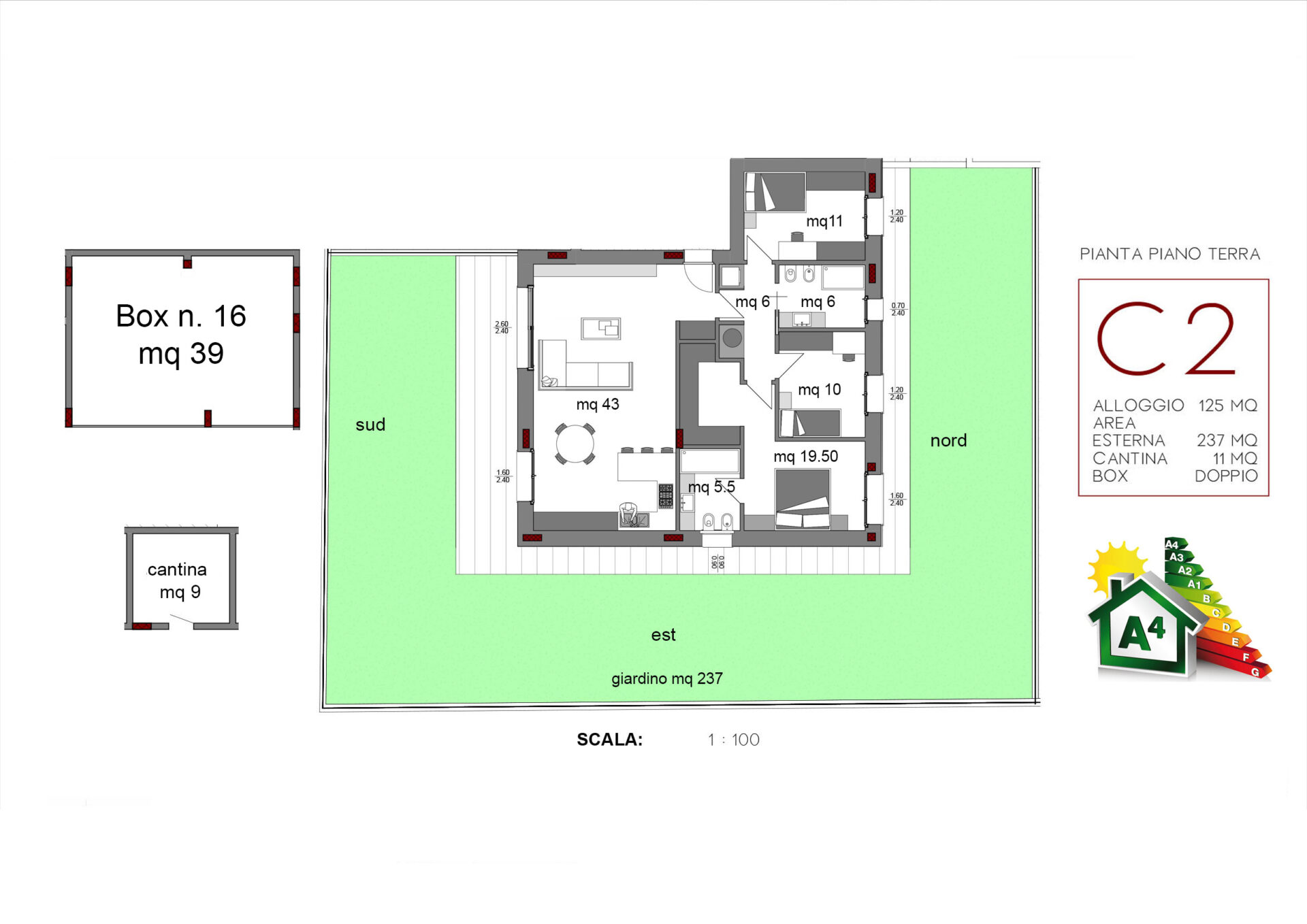 SPAZIOSE zone giorno con luminose vetrate, GRANDI camere da letto matrimoniali con vere cabine armadio, AMPIE terrazze vivibili per i primi piani, VASTI giardini per i piani terra (ma anche più piccoli per chi desidera il giardino ma con metrature più contenute) appartamenti tutti caratterizzati da un architettura moderna, contemporanea e innovativa grazie al capitolato di altissima qualità. Completano le soluzioni grandi box doppi in larghezza e cantine inclusi nel prezzo!